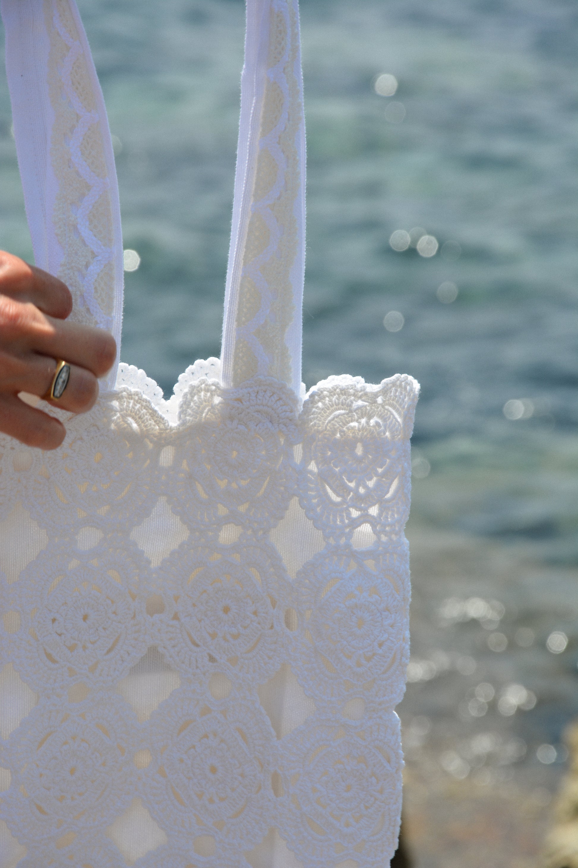Una delicata borsa tote realizzata in pizzo all'uncinetto in stile vintage, foderata in morbido cotone e rifinita con manici ricamati.