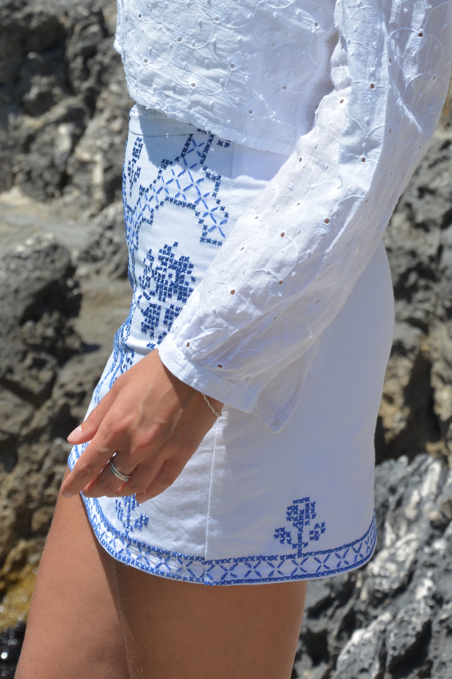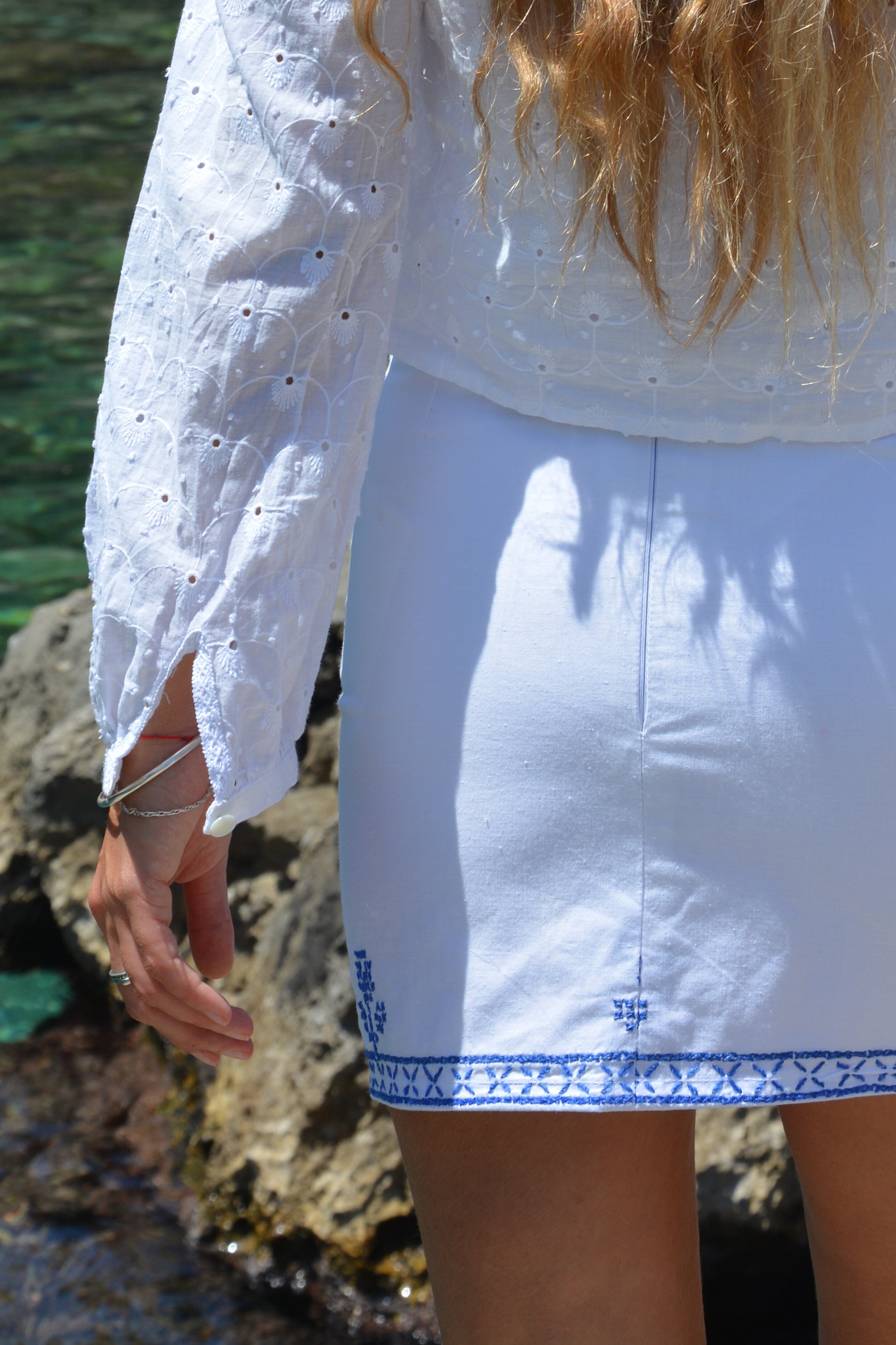 Un capo essenziale per l'estate, realizzato in cotone riciclato e ricamato a mano a punto croce in un delicato blu. Il Mini Brava trae ispirazione dalle piastrelle costiere e dai patii fioriti, infondendo un tocco di tradizione in una silhouette elegante e raffinata. Pensato per essere indossato a vita alta, si chiude con una cerniera nascosta sul retro. Leggero, traspirante e unico nel suo genere.