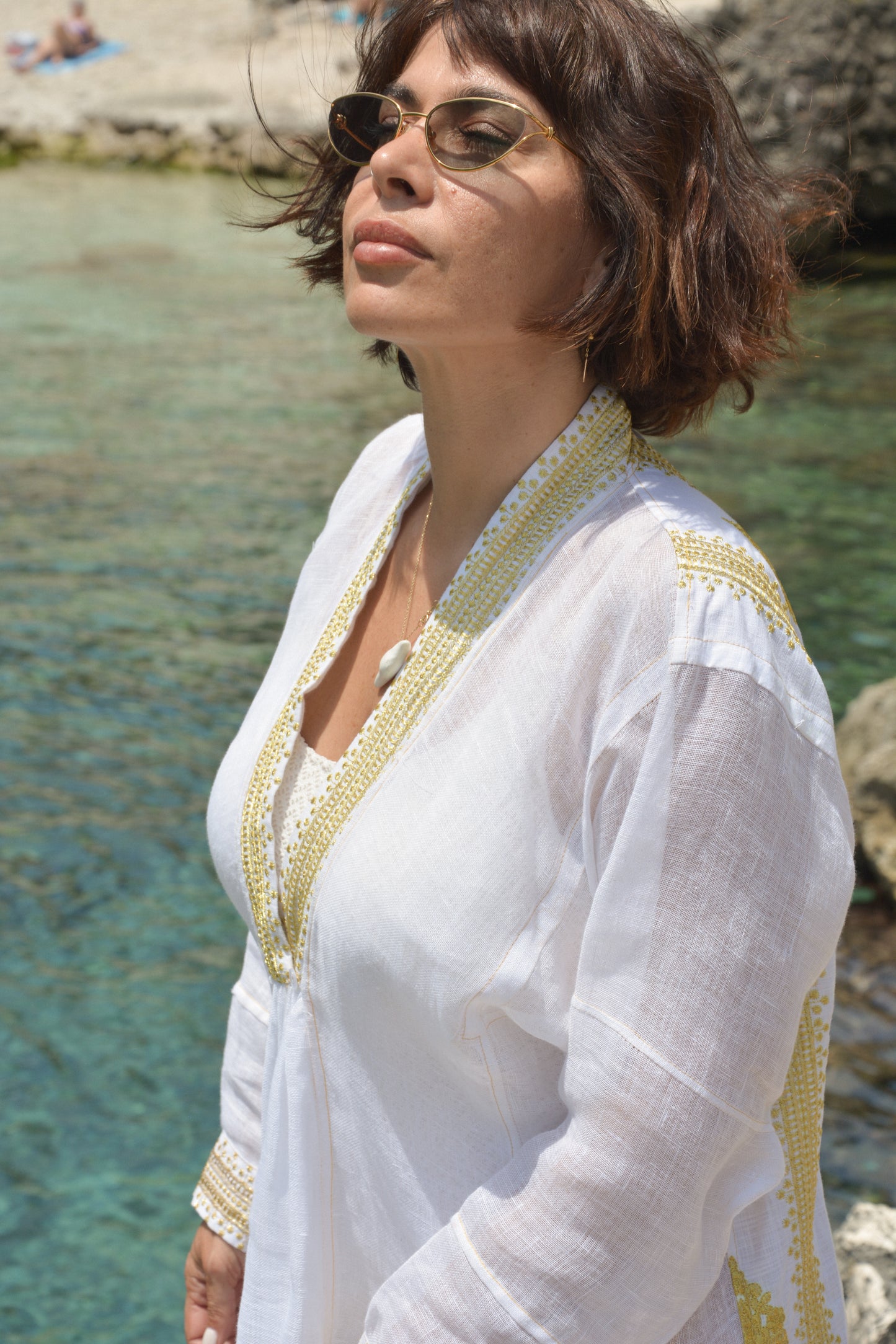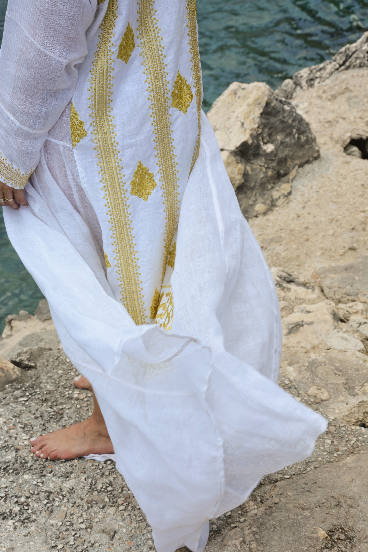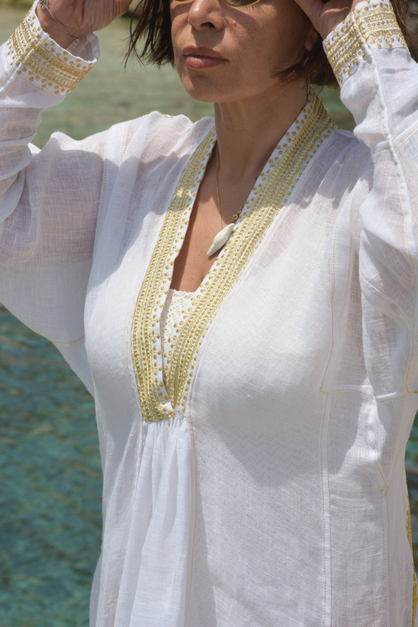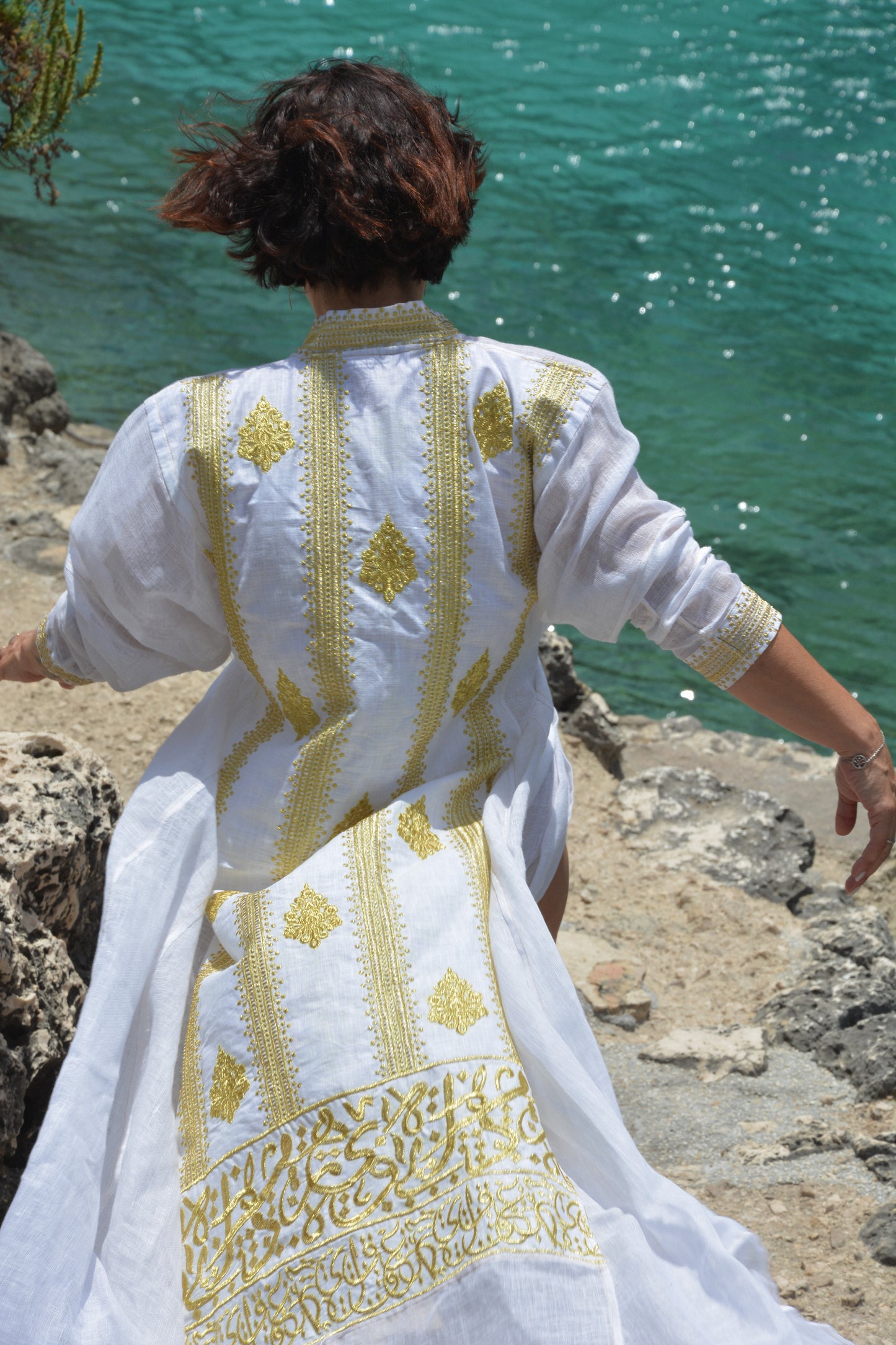 Questo capo è un'interpretazione contemporanea del tradizionale thobe nashal del Bahrein, realizzato a mano in organza di puro lino.